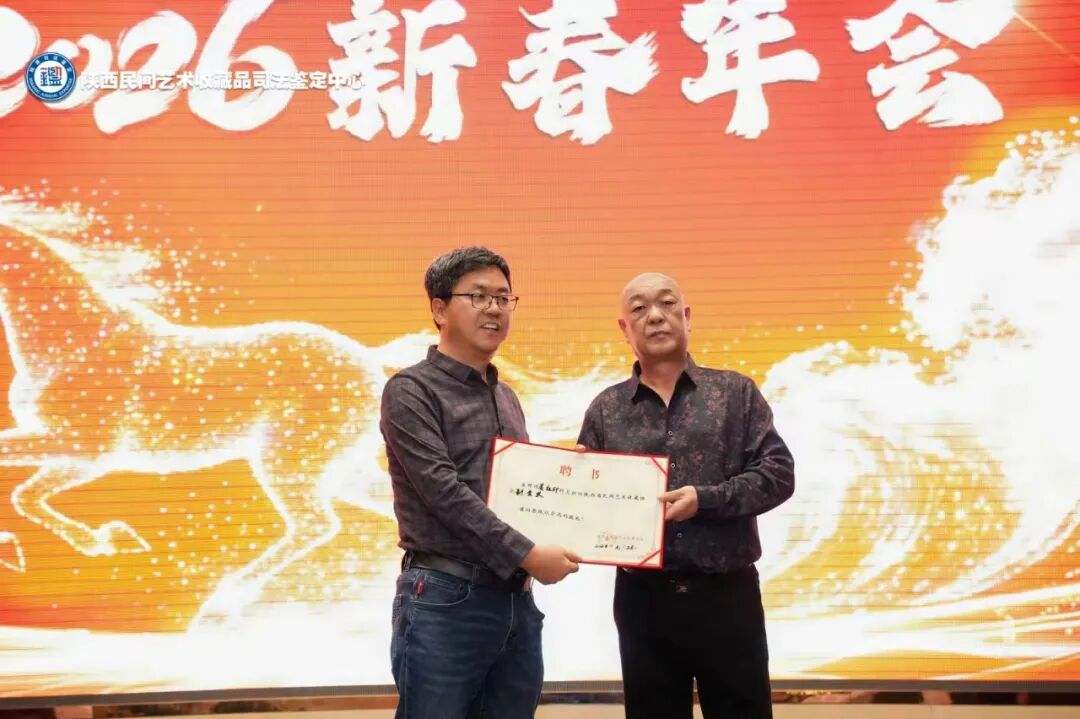现场,陕西省民间艺术收藏协会会长史恒为姜红印颁发聘书,此举旨在吸纳更多专业力量,助力协会在司法鉴定、文化传承等领域的工作再上新台阶。作为协会会长暨陕西民间艺术收藏品司法鉴定中心负责人,史恒在总结致辞中回望过往、展望未来:“十五年来,我们始终以传承中华文脉为己任,通过规范行业秩序、强化专业服务,让民间瑰宝走出深闺、绽放光彩。新的一年,我们将深化‘政策 + 技术 + 金融’融合,推动民间收藏在规范化。